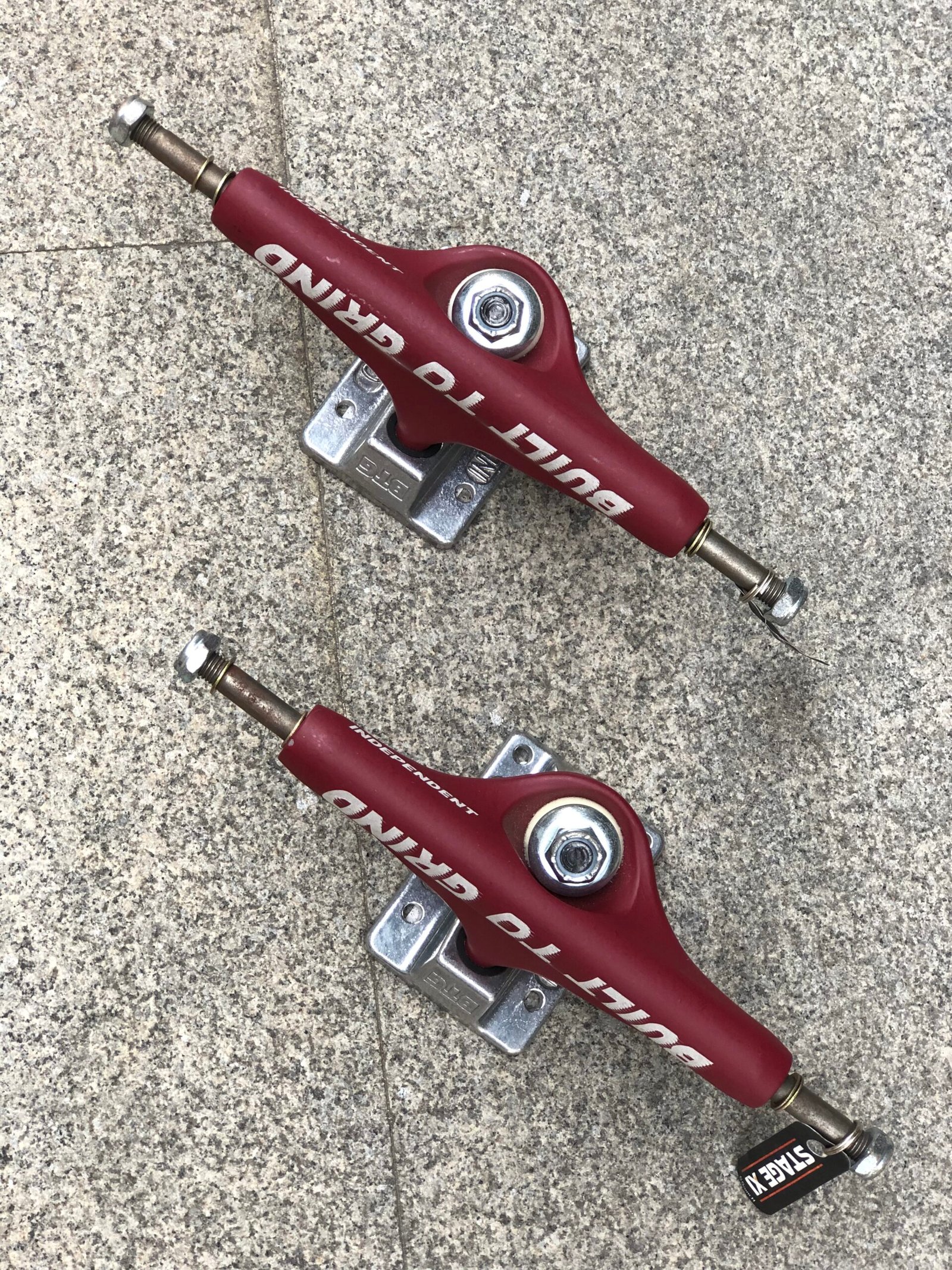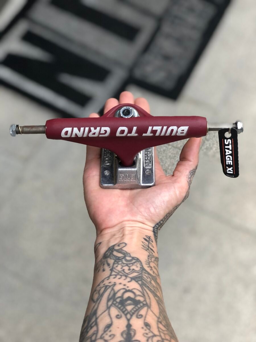 - Design “Built to Grind” (BTG): O truck é construído com o lema “Built to Grind” (Feito para moer), apresentando uma trave (hanger) revestida em pó na cor bordô (burgundy) e gravada a laser com o logotipo BTG, e uma base (baseplate) prateada polida.